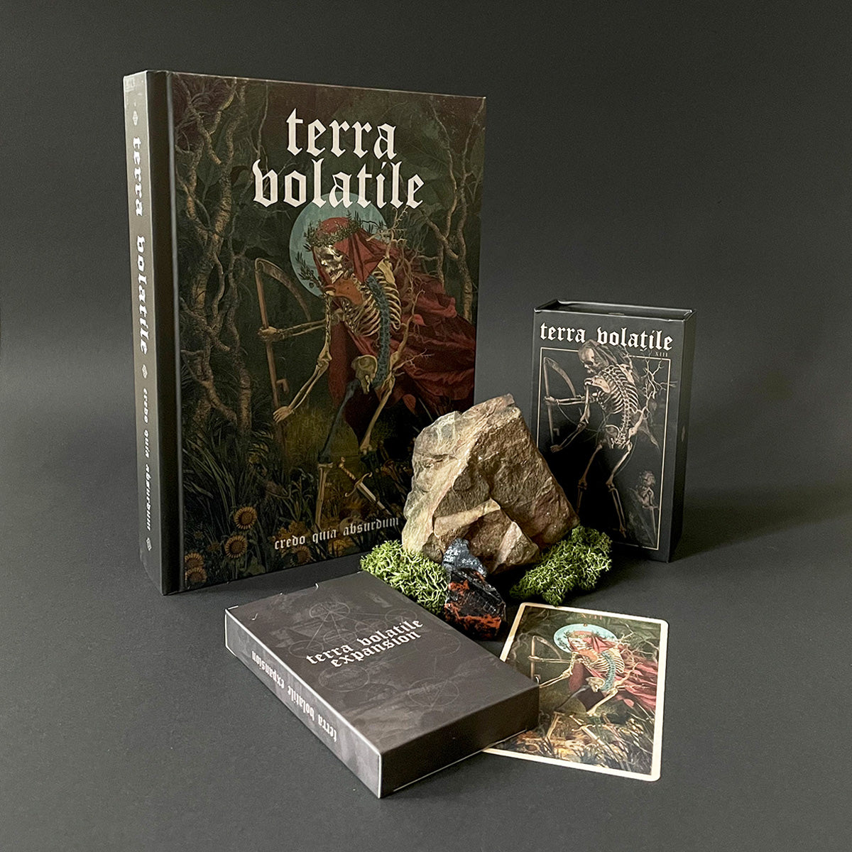 Collection of 'terra volatile' books, cards, and a rock-like object on a dark background