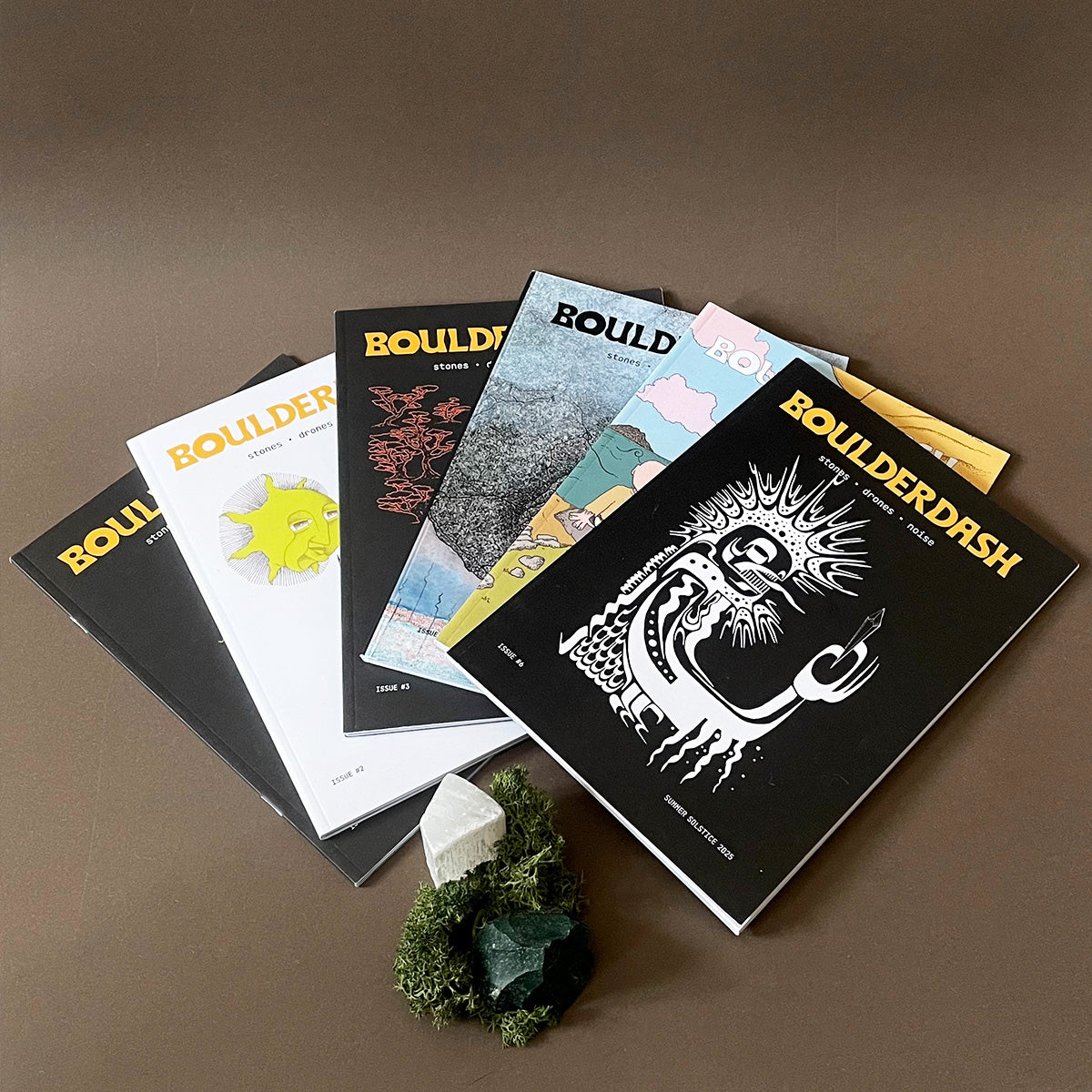 All six issues of Boulderdash, a DIY zine for enthusiasts of stones, drones & noise.
