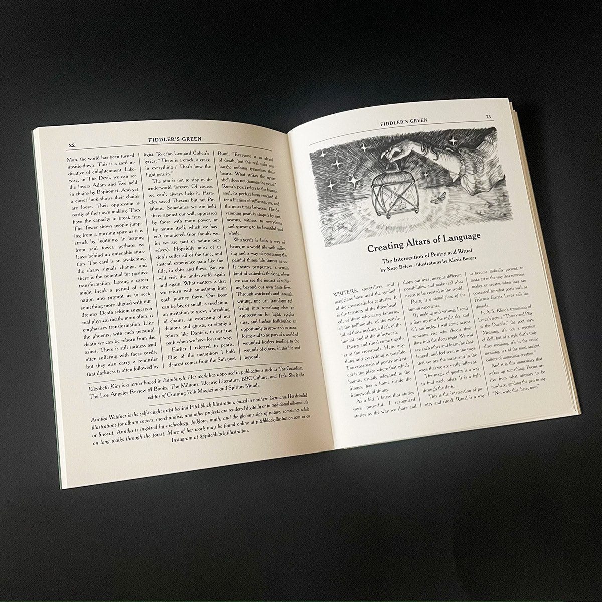 Fiddler’s Green 9 features copper titling, a cover drawn by Arik Roper, and 56 pages of art and magic, including reviews, a letters column, and the following: