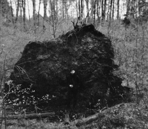 Open book with a drawing of a plant root on the left page and a photo of a person in a forest on the right page.