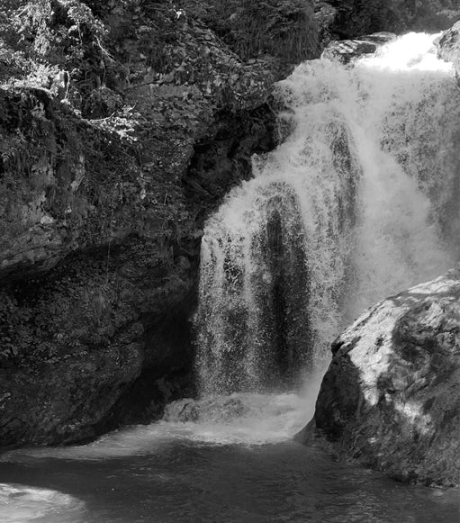 Open book held by hands with a black and white photograph of a waterfall on a dark background