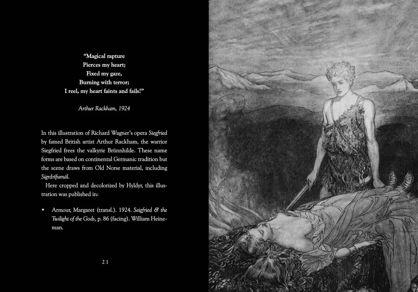 Linguistically dated to the late pagan period of the Viking Age, Sigrdrífumál is a fascinating poem that features the voice of a valkyrie, here called Sigrdrífa (meaning ‘victory-driver; victory-bringer’). Awoken from her thorn-induced slumber, the valkyrie recites a pagan prayer to the gods before offering a horn of drink and feverishly reciting intense wisdom and runic magic to the hero. Preserved in a fragmentary state, the poem is enigmatic not only for its mysticism and insight into the Younger Futhark, the Viking Age development of the runic alphabet, but also for the Hávamál-like wisdom it provides cloaked in ethereal and uncanny imagery.