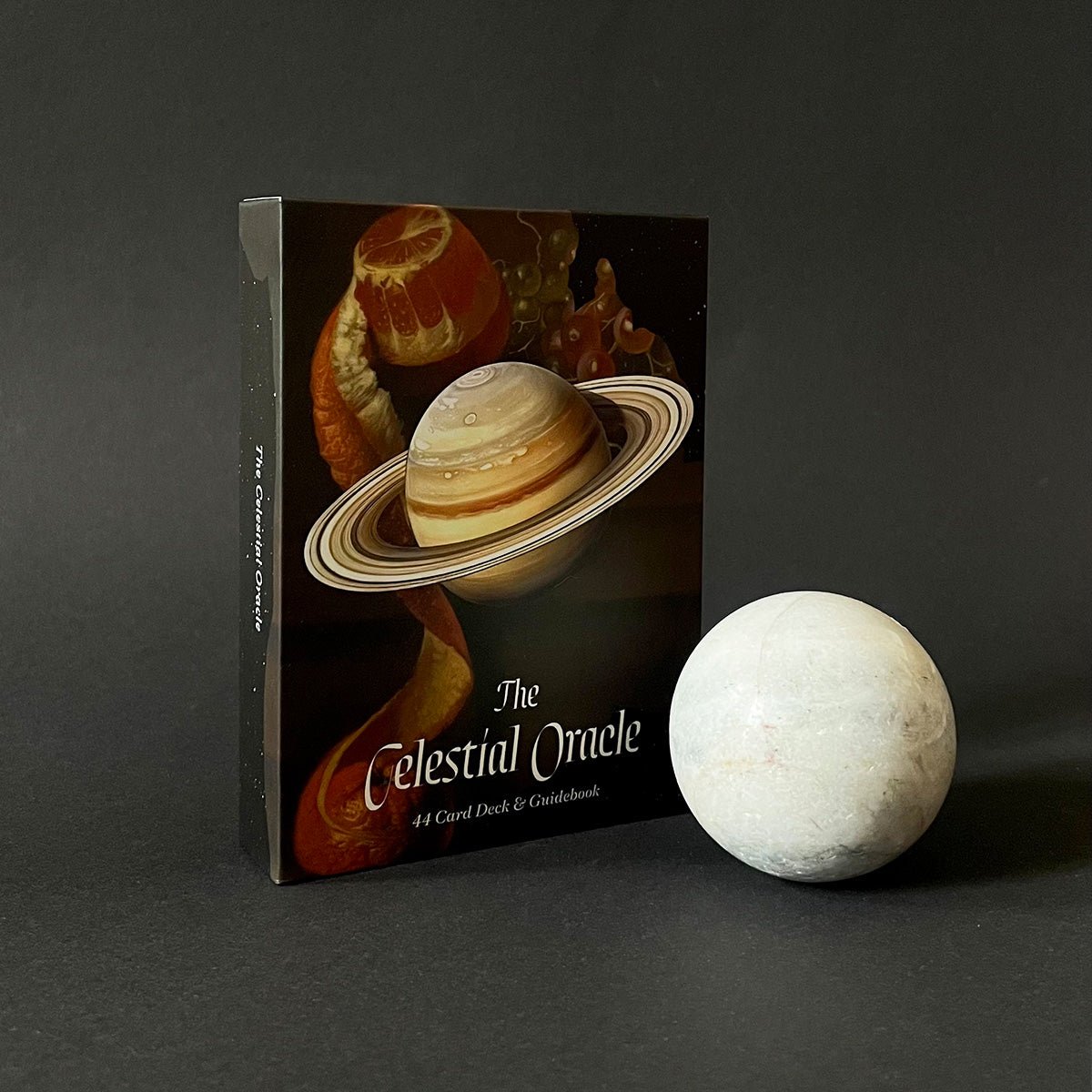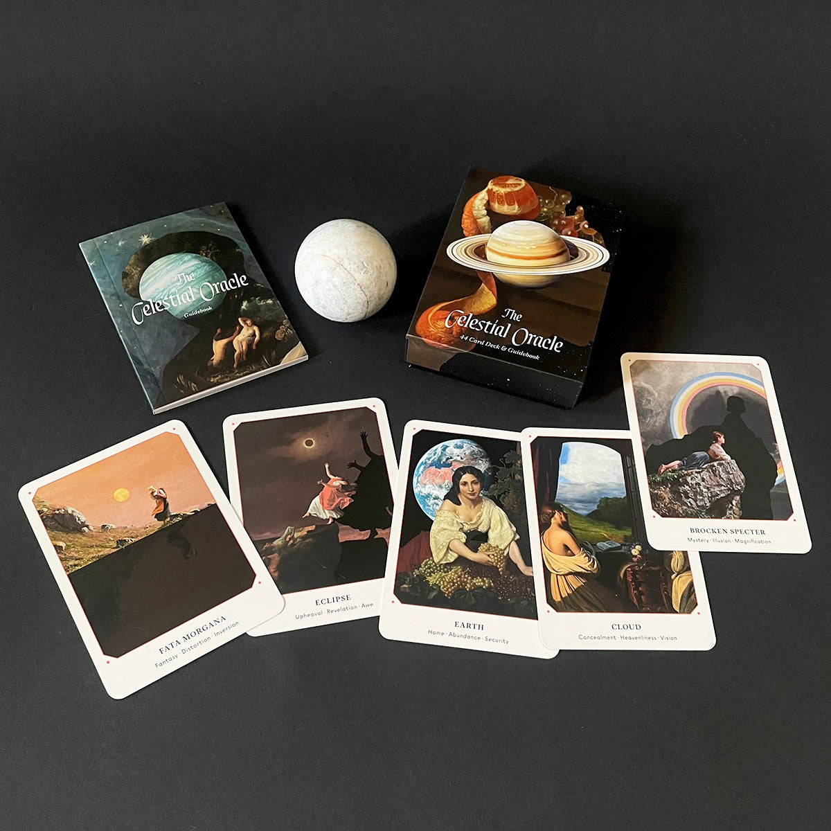 Set of 'Celestial Oracle' cards with a spherical object on a dark background